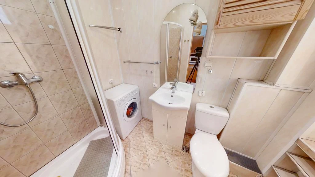 - Bad-Ausstattung: Waschbecken, WC, Waschmaschine, Dusche, Badewanne