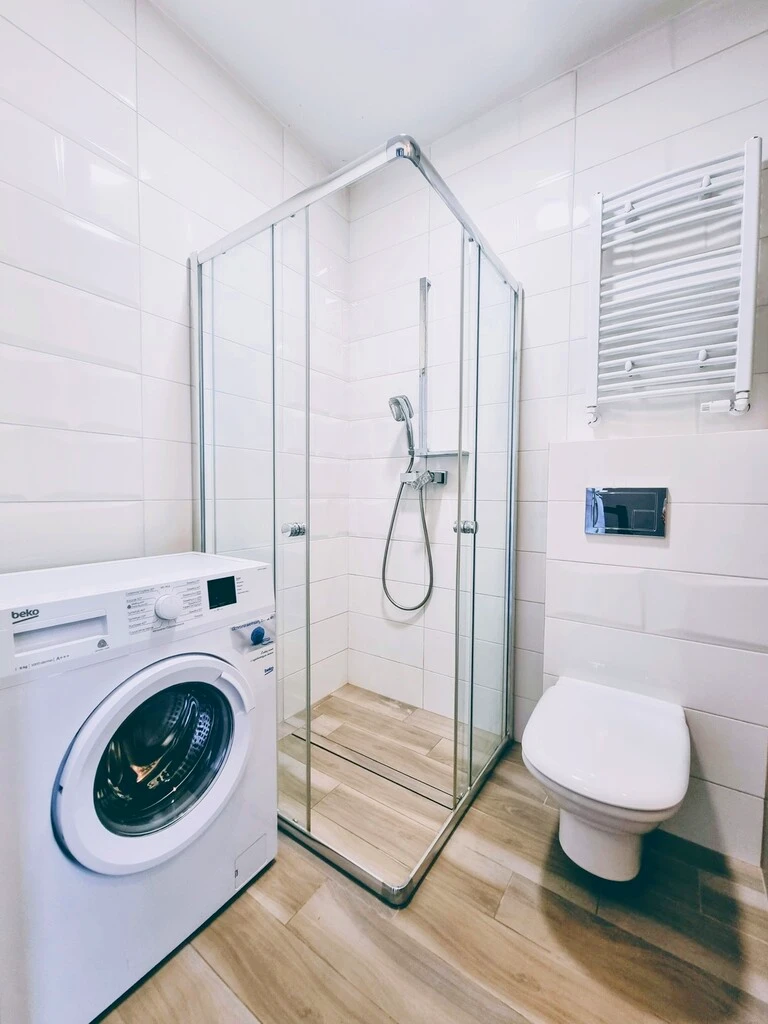 - Badezimmer mit Dusche, Waschbecken, Toilette und Waschmaschine