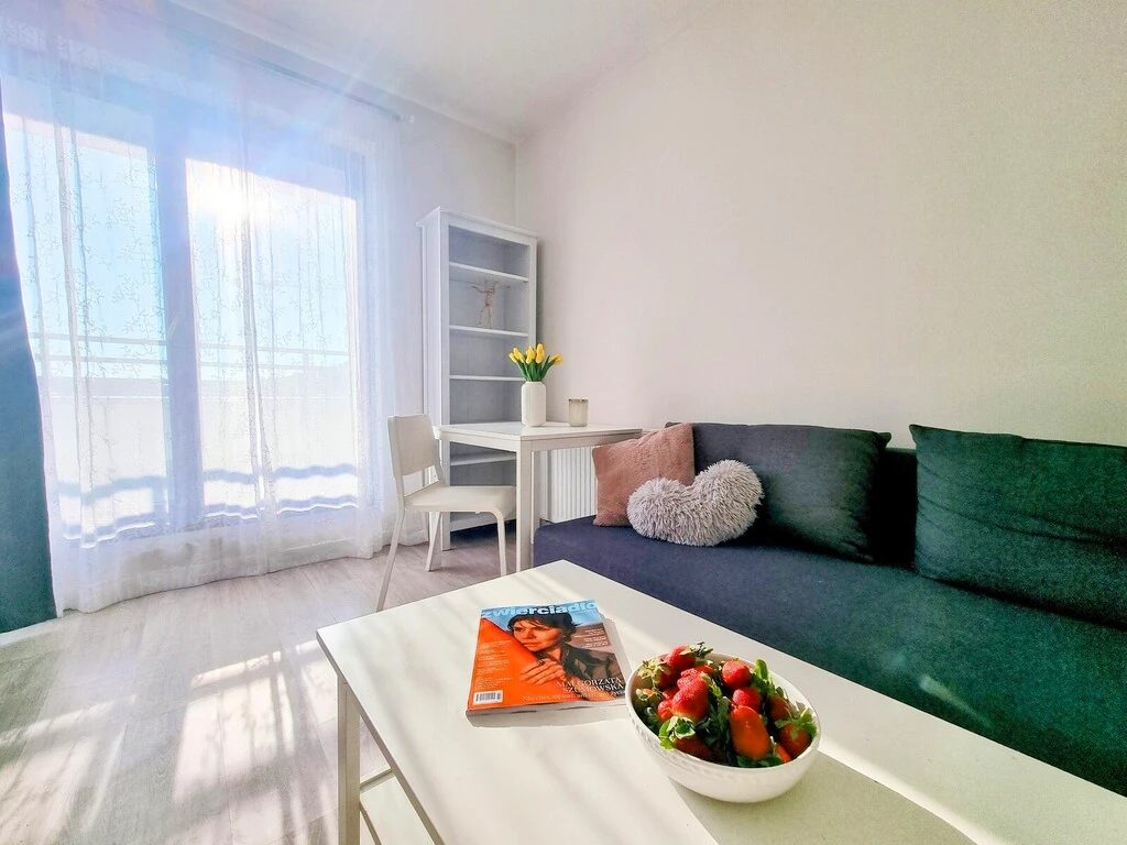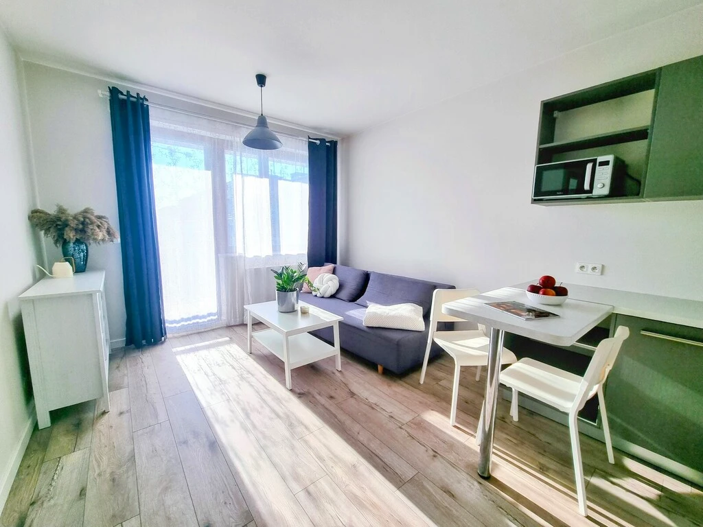 Die Einbauküche ist mit hochwertigen Geräten ausgestattet: Kühlschrank mit Gefrierfach, Kochfeld, Dunstabzugshaube, Geschirrspüler und Mikrowelle. Im Wohnzimmer stehen ein Sofa, ein Couchtisch sowie ein Esstisch mit Stühlen zur Verfügung. Das Schlafzimmer verfügt über ein großes Bett, eine Kommode und einen Einbauschrank. Zwei zusätzliche Kleiderschränke bieten weiteren Stauraum – einer davon im Wohnzimmer, der zweite im gemeinschaftlichen Flur.