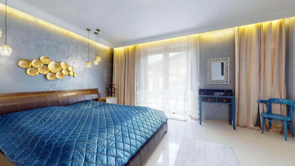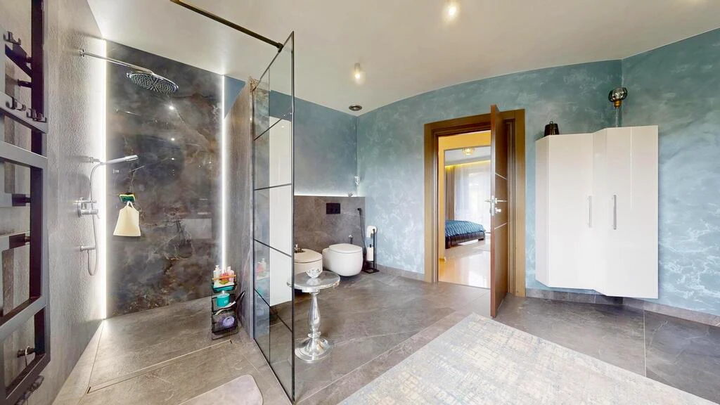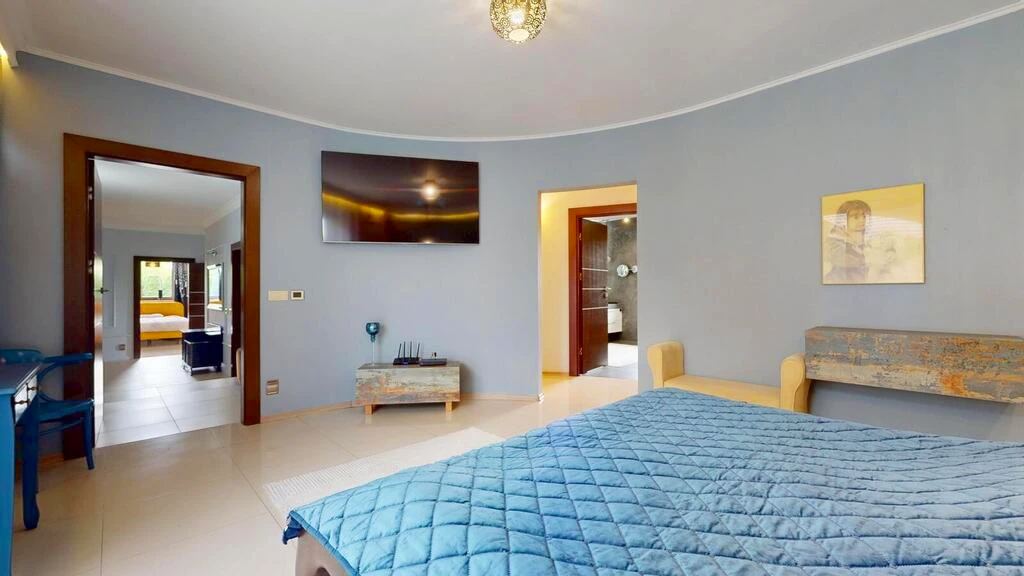 - ein luxuriöses Hauptschlafzimmer mit zwei begehbaren Kleiderschränken und eigenem Spa-Badezimmer, ebenfalls mit Terrassenzugang,