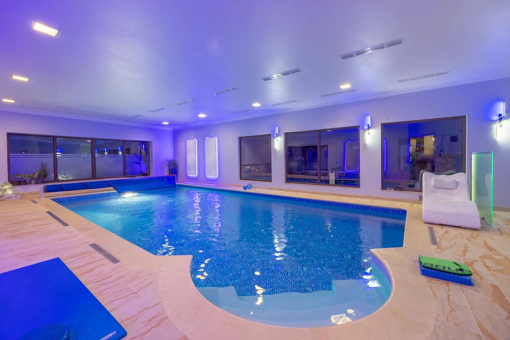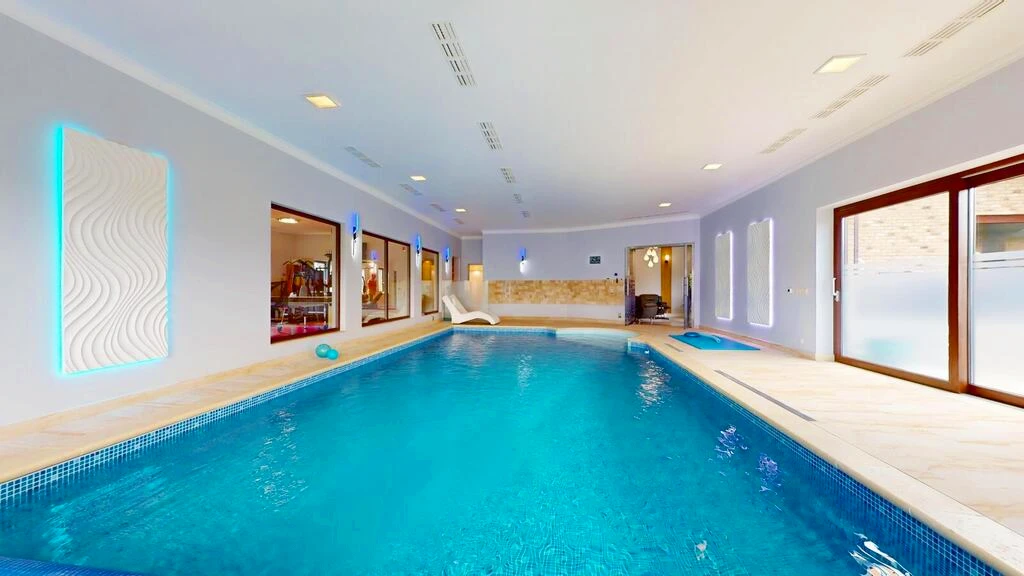 - einem beheizten, überdachten Pool (50 m², Maße: 5 x 10 m, Tiefe: 120–160 cm),