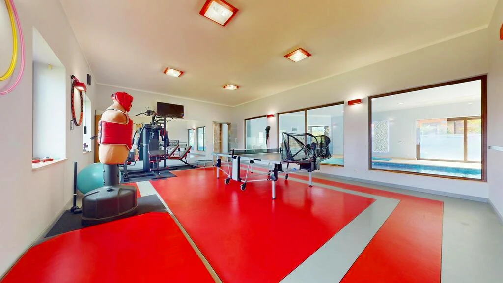 - einem komplett ausgestatteten Fitnessraum mit speziellem Bodenbelag, wie er in professionellen Studios verwendet wird.