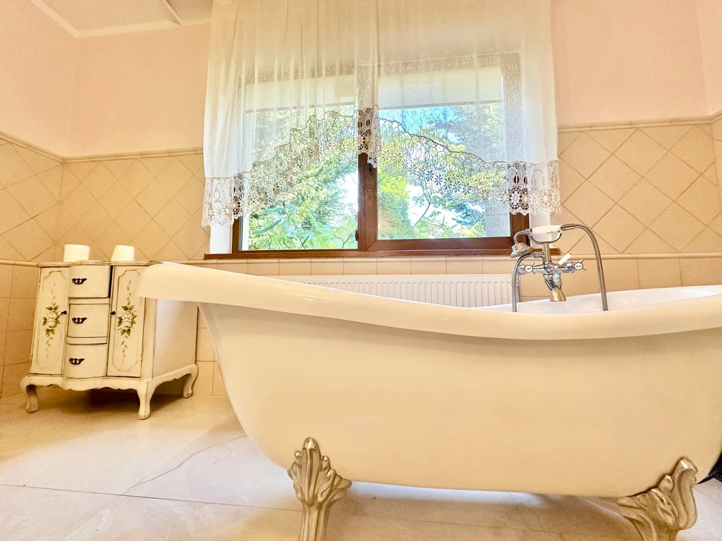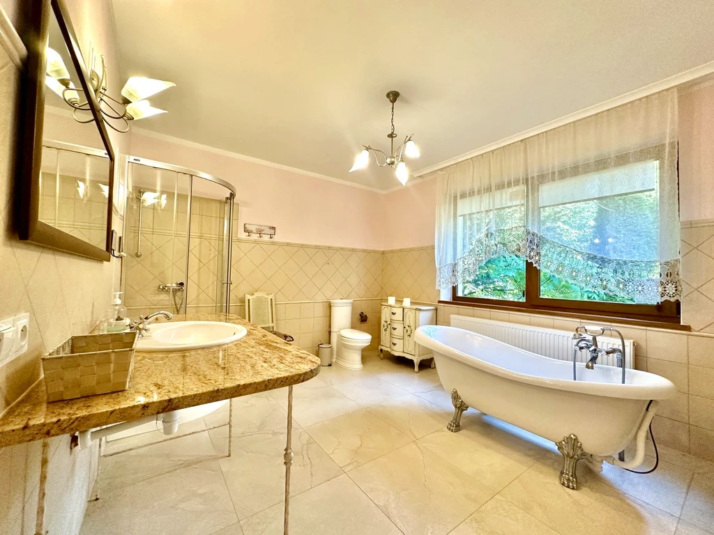 - Ausstattung: Handtuchheizkörper, Dusche, Fenster, Waschbecken, Badewanne, WC