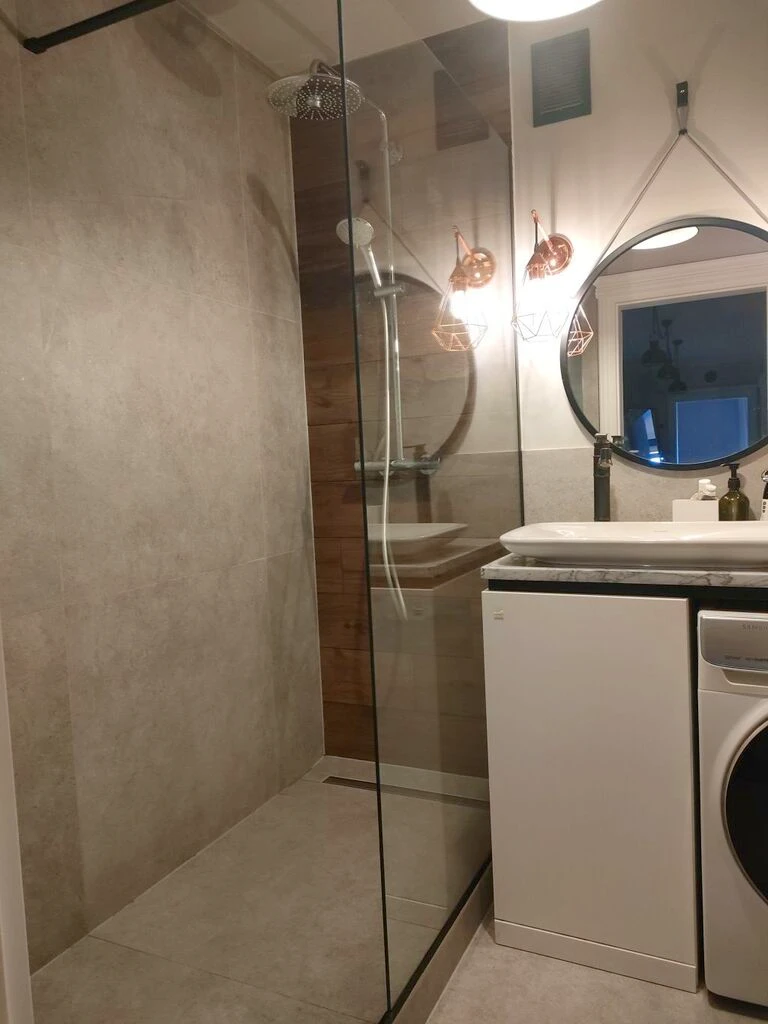 Das modern ausgestattete Badezimmer verfügt über eine Dusche, Waschbecken, WC und eine integrierte Waschmaschine. Zur weiteren Ausstattung gehören: Kühlschrank, Backofen, Geschirrspüler, Mikrowelle, Kabelfernsehen, Internetanschluss sowie ein Türsprechsystem.