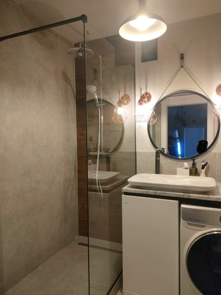 - Bad: 1 Badezimmer mit Waschbecken, WC, Dusche und Waschmaschine