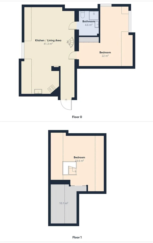 - Zimmergrößen: 22 m² und 23,6 m² (weitere Fläche entfällt auf Küche und Flur)