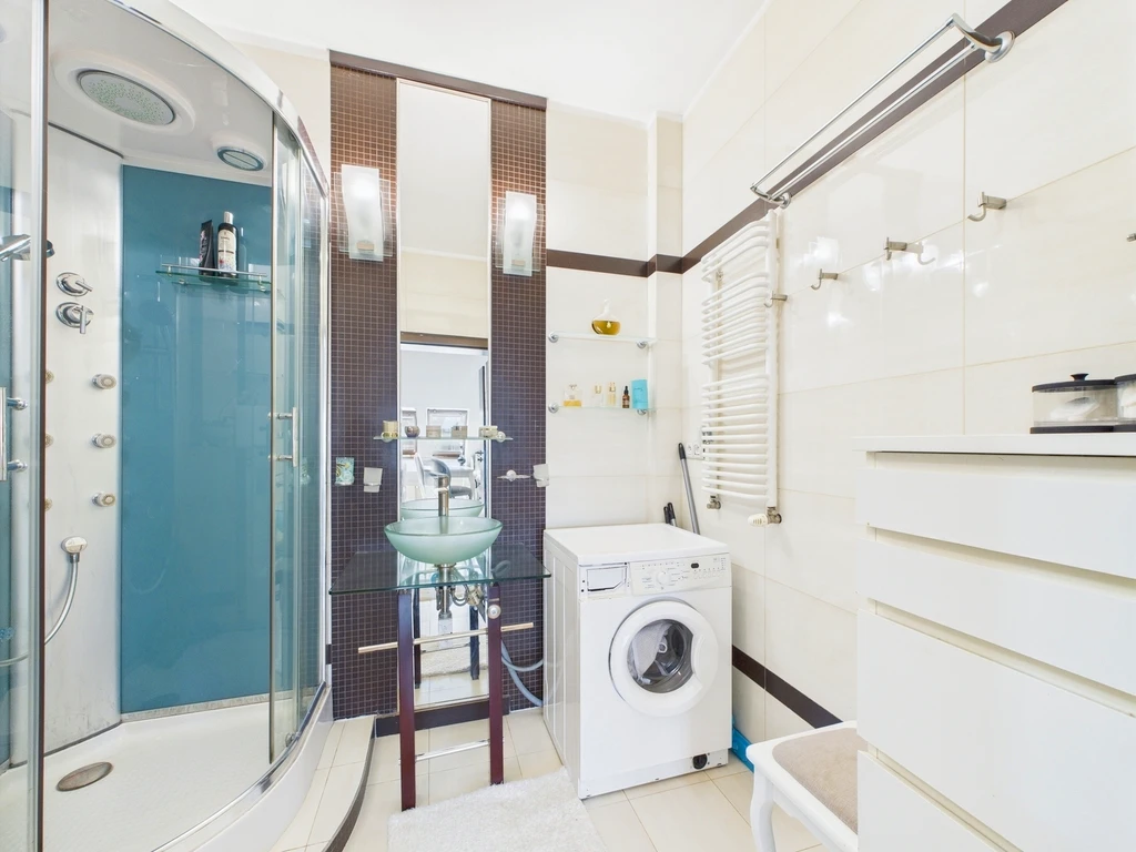 - Badezimmer: Waschmaschine, Handtuchheizkörper, Waschbecken, WC, Dusche