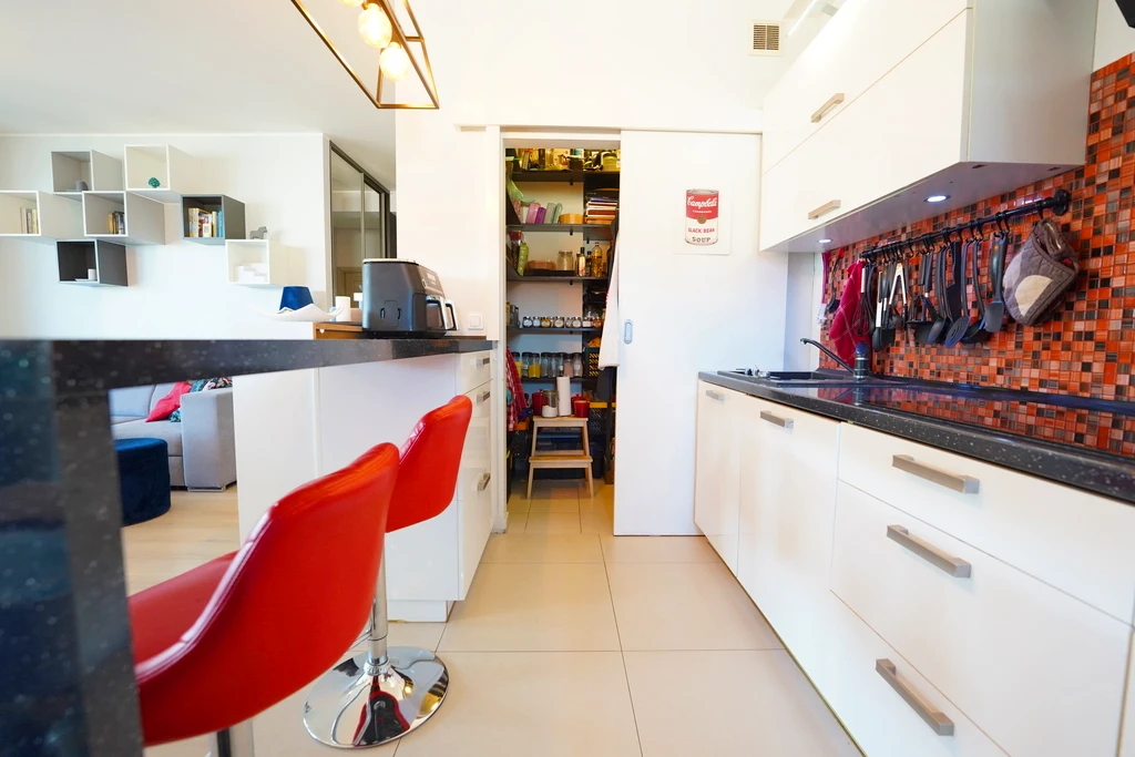 - Moderne Küche mit Durchreiche, voll ausgestattet mit Kühlschrank, Backofen und Geschirrspüler