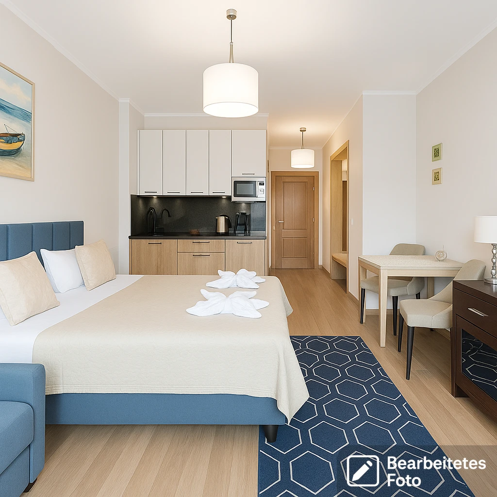 - einen offenen Wohnbereich mit Küchenzeile und direktem Zugang zum Balkon,