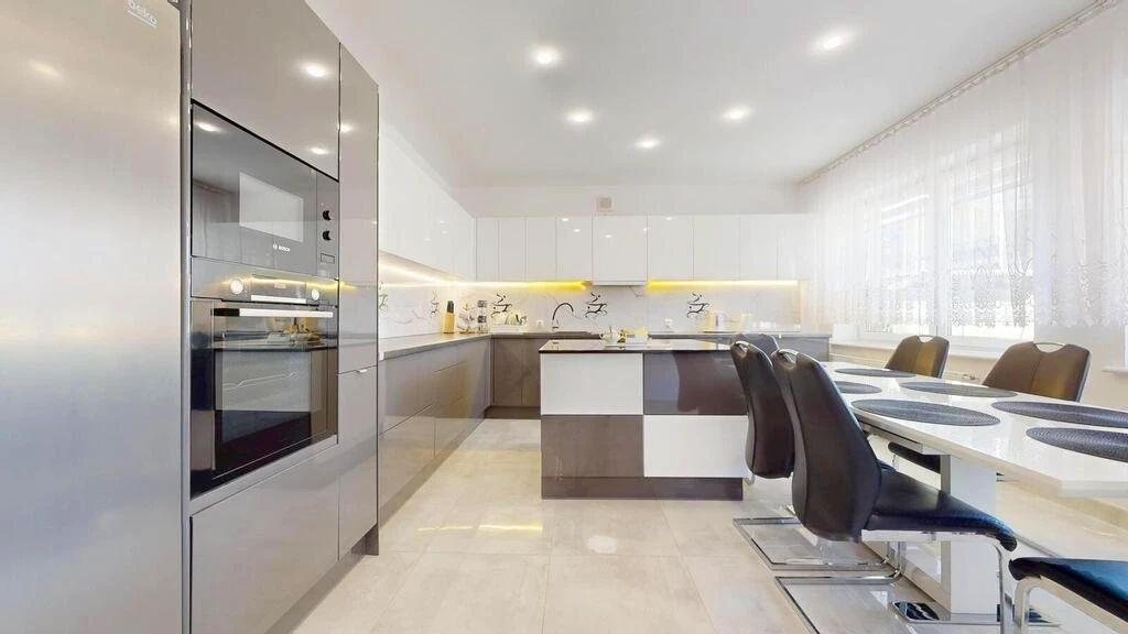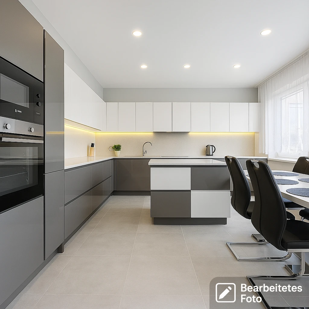 - Moderne Küche mit großzügigem Essbereich und maßgefertigten Einbaumöbeln inklusive Haushaltsgeräten