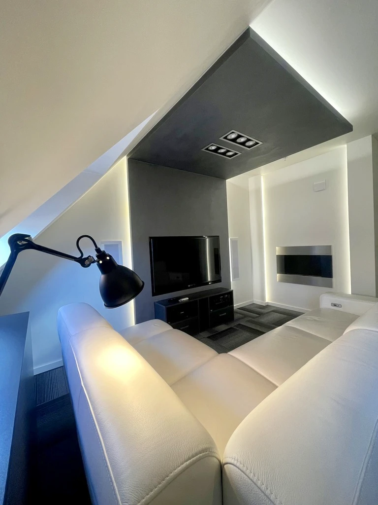 - Integrierte TV- und Audiosysteme von Monitor Audio – Wohnzimmer mit spezieller schallisolierter Wand (Mineralwolle)
