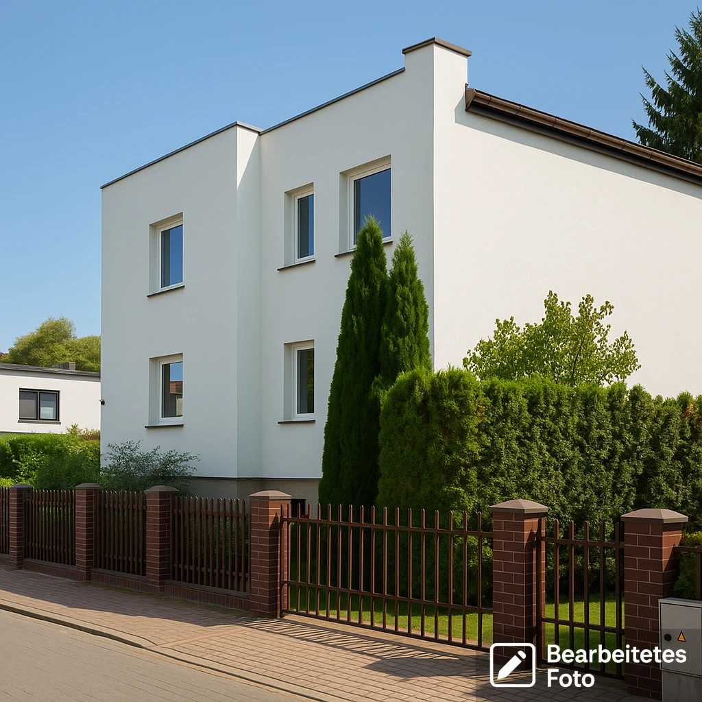 - Außenbereich: eingezäunt (Holzzaun), rechteckiges Grundstück