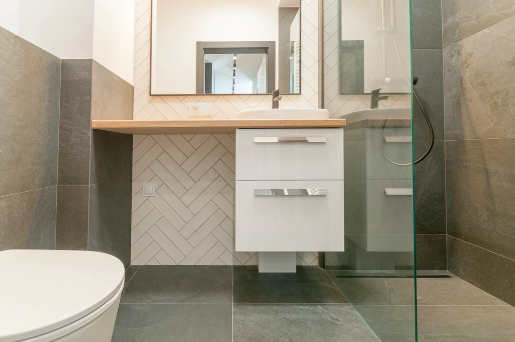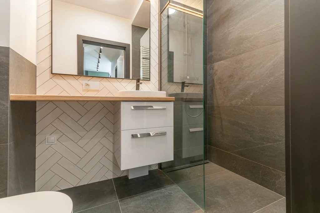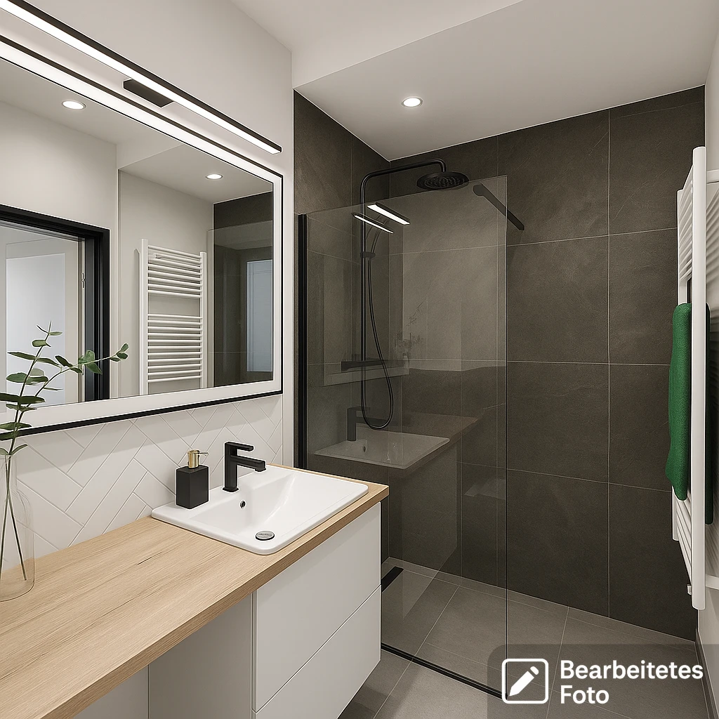 - Stilvoll ausgestattetes Badezimmer mit bodengleicher Walk-in-Dusche, Einbauspülung (Geberit), Waschtisch mit Unterschrank