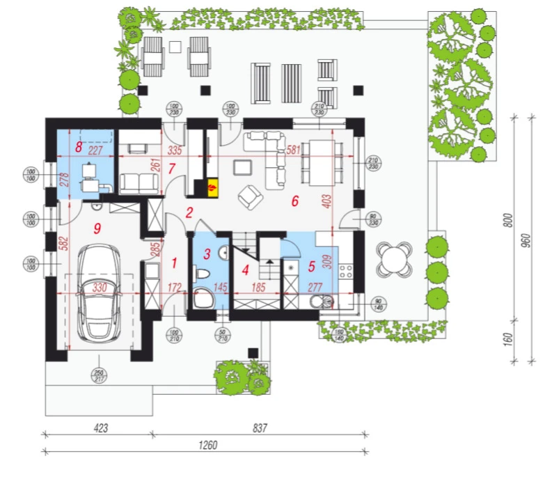 - Grundstücksgröße: 1.000 m² – flach und rechteckig, eingezäunt, mit Zierbüschen und Bäumen bepflanzt.