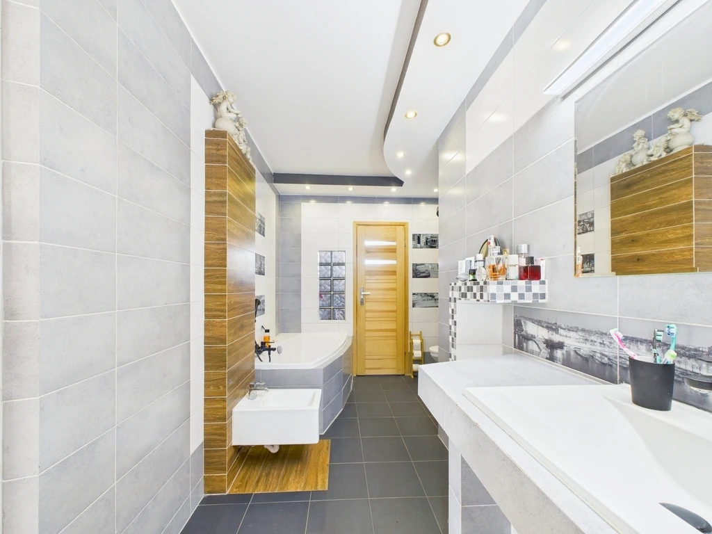 - Großes Badezimmer (ca. 10,76 m²) mit Badewanne, Dusche, WC, Bidet, Fenster und Waschmaschine