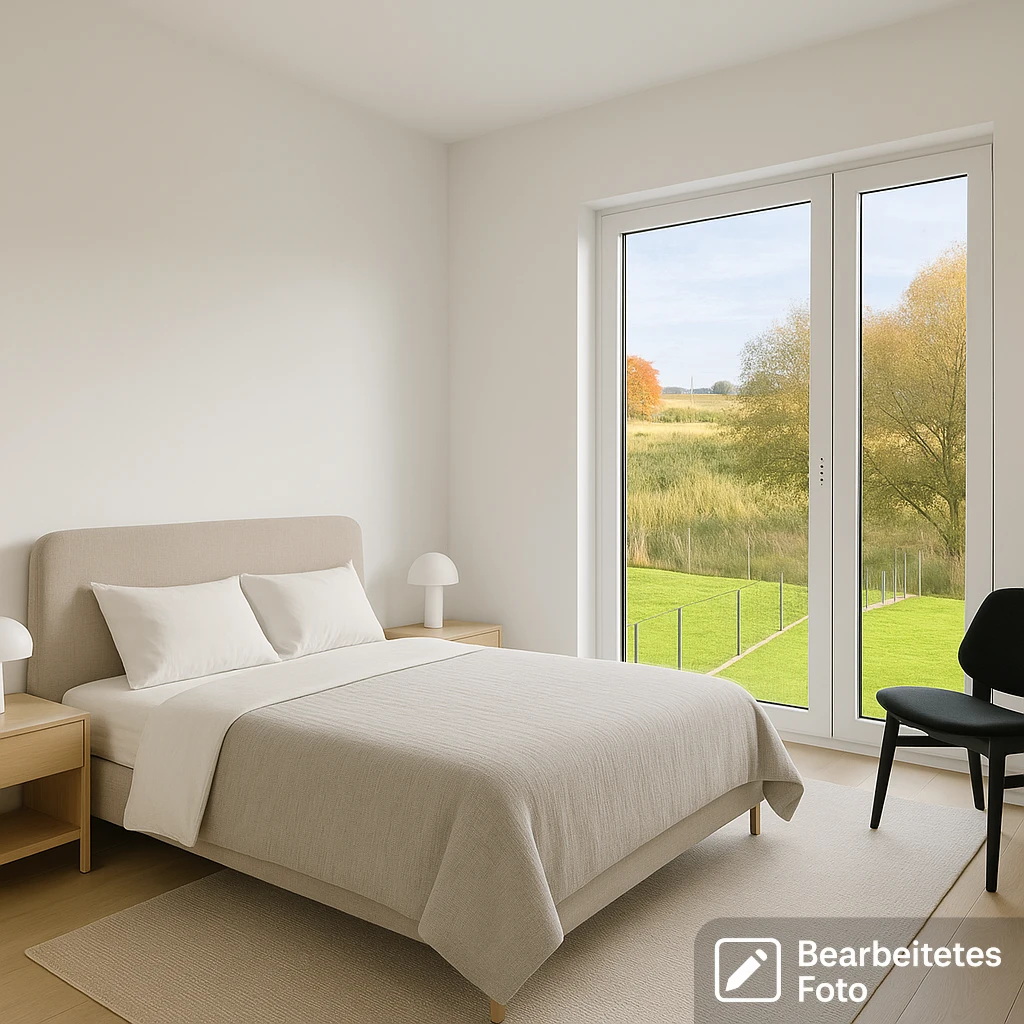 - Moderne, offene Raumaufteilung mit großen Kunststofffenstern für viel Tageslicht