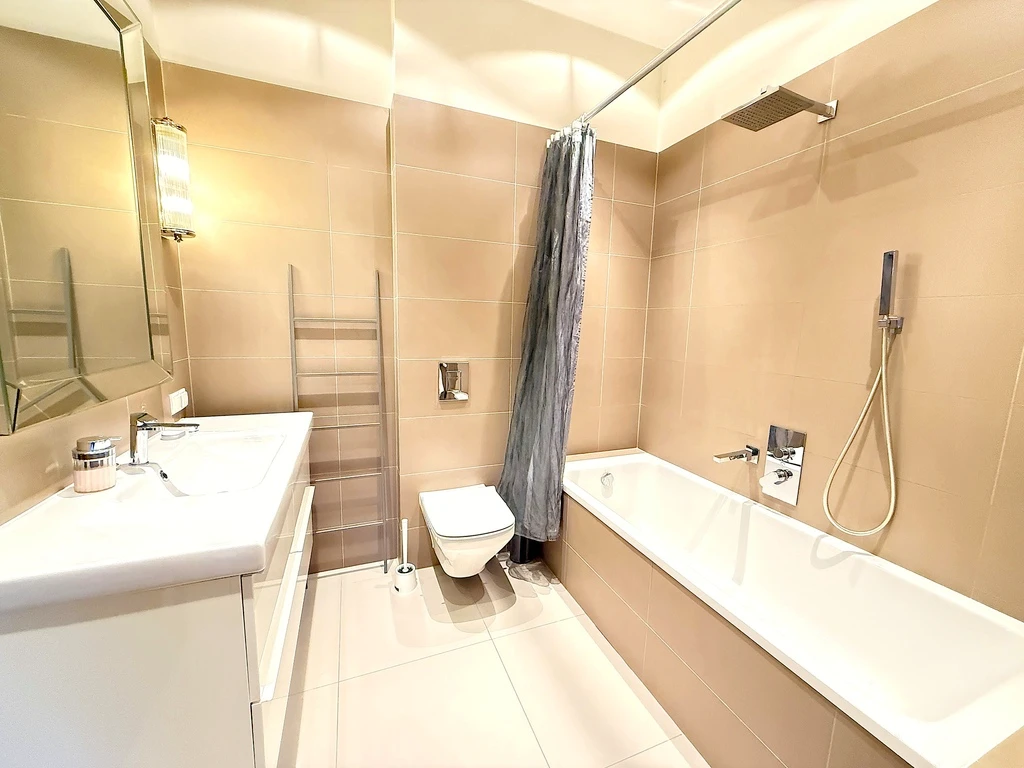 - Modernes Bad mit Badewanne, Wand- und Bodenfliesen.