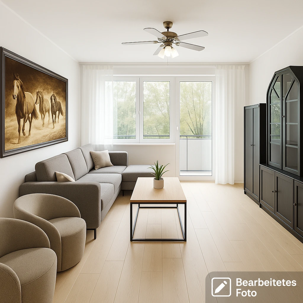 - Das erste Foto in unserer Galerie wurde leicht bearbeitet, um zu veranschaulichen, wie die Wohnung aussehen könnte – beispielsweise durch eine geänderte Wandfarbe. Die nachfolgenden Bilder zeigen den tatsächlichen Zustand der Immobilie.