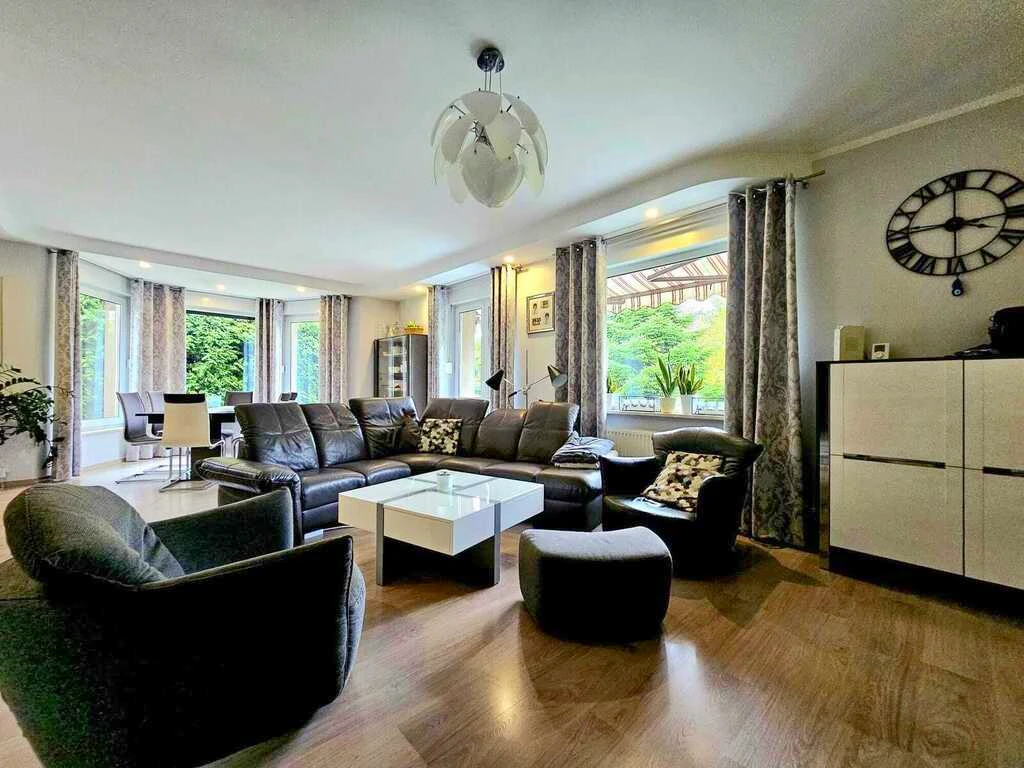 - Geräumiges Wohnzimmer mit Essbereich und direktem Zugang zur Terrasse und Garten