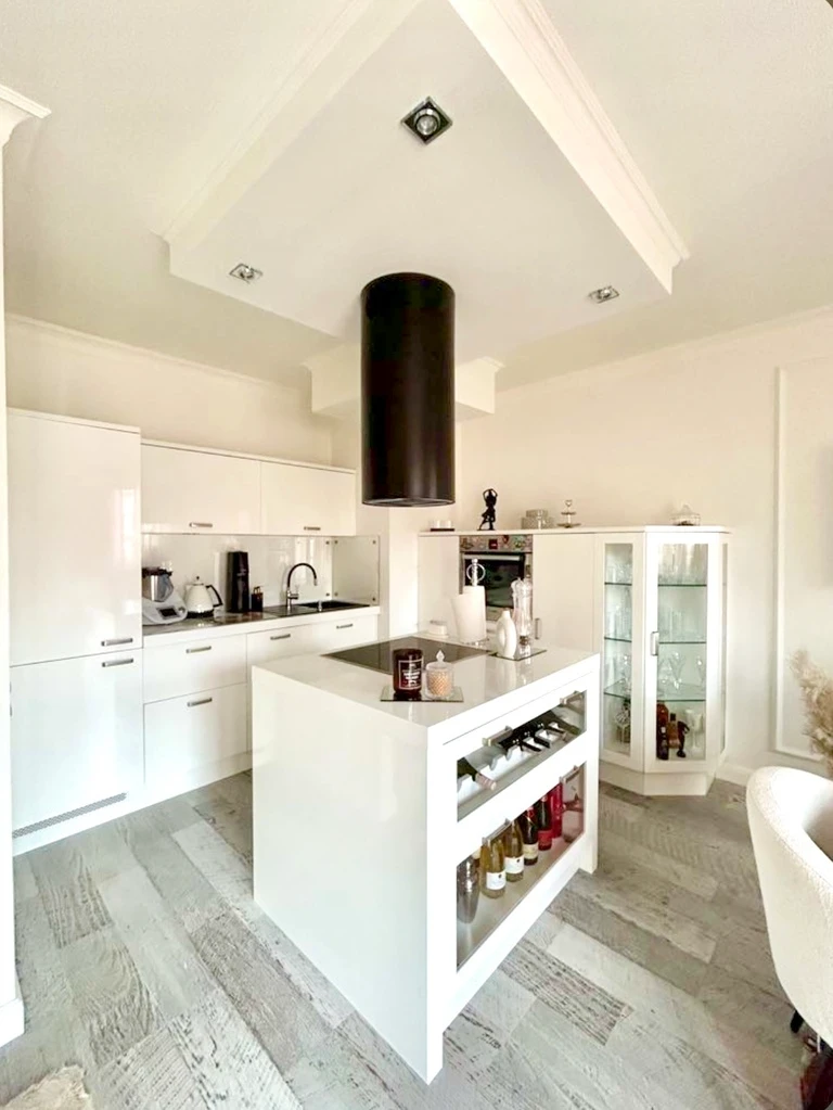 Die moderne Küche ist das Herzstück des Apartments – vollständig ausgestattet, funktional und bereit für ausgiebiges Kochen, entspannte Frühstücke und lange Gespräche bis in die Nacht. Backofen und Geschirrspüler sind natürlich vorhanden.