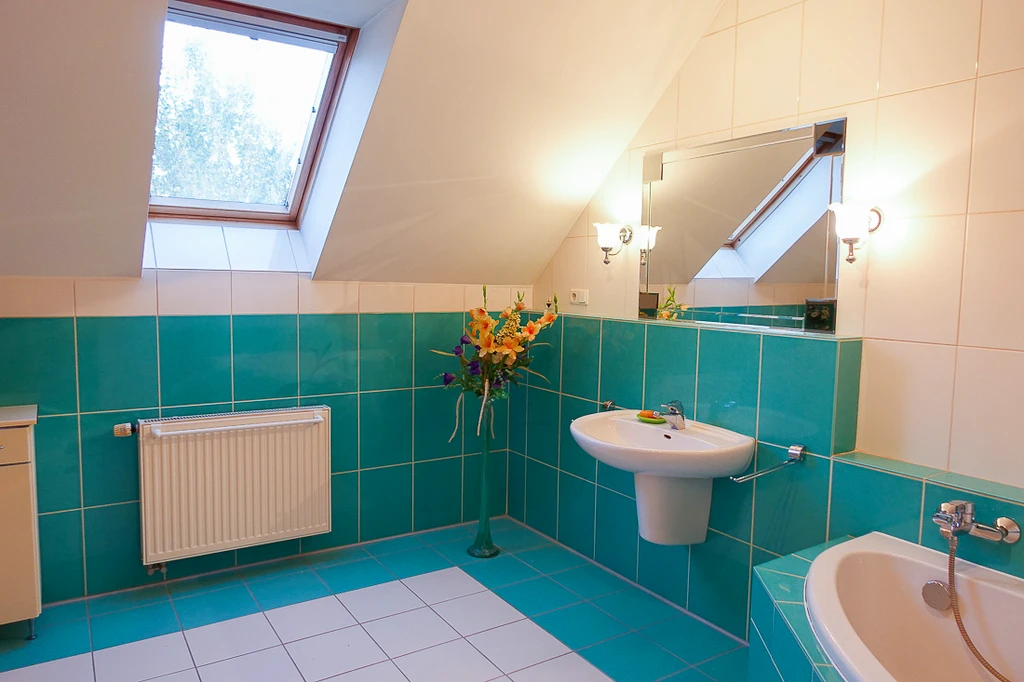 - Badezimmer (11,1 m² / Bodenfläche: 13,5 m²): Mit Badewanne, Bidet, WC, Waschtisch, Dachflächenfenster und Möglichkeit zum Einbau einer Dusche.