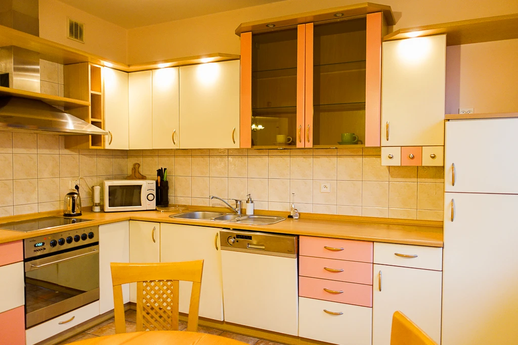 Ausgestattet mit Kühlschrank, Elektroherd, Backofen und Geschirrspüler