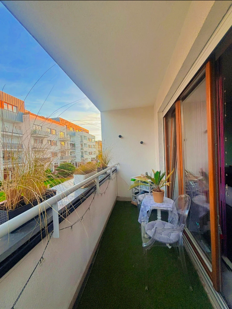 - Gemütliches Wohnzimmer mit Zugang zu einem großzügigen Balkon im Loggia-Stil