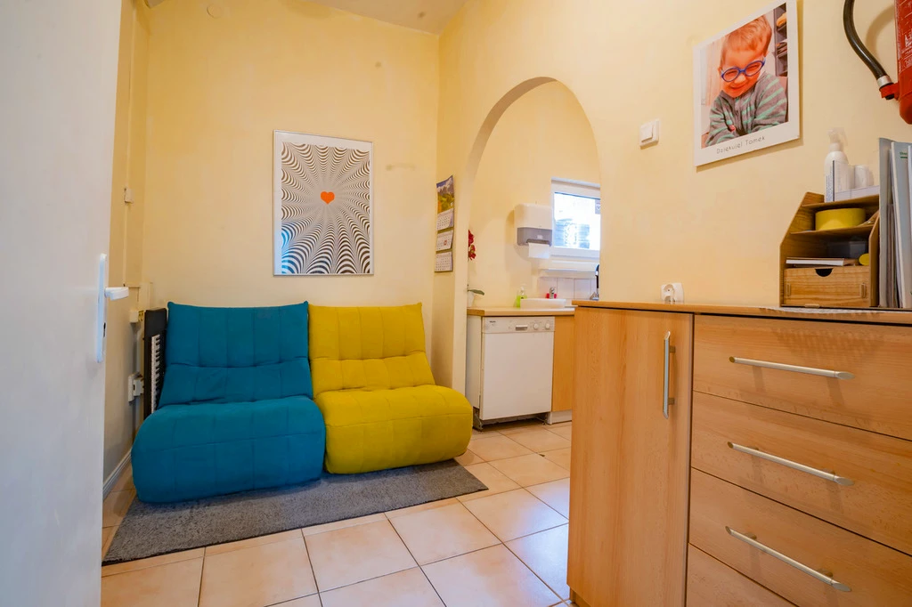 Zusätzlich verfügt die Immobilie über einen unabhängigen Anbau mit separatem Eingang und eigener Adresse, der derzeit als Kindergarten genutzt wird. Dieser Bereich (ca. 111 m²) besteht aus einem großzügigen Raum, zwei weiteren Zimmern, zwei Bädern, Küche und Flur – ideal für eine gewerbliche Nutzung oder als separate Wohneinheit.