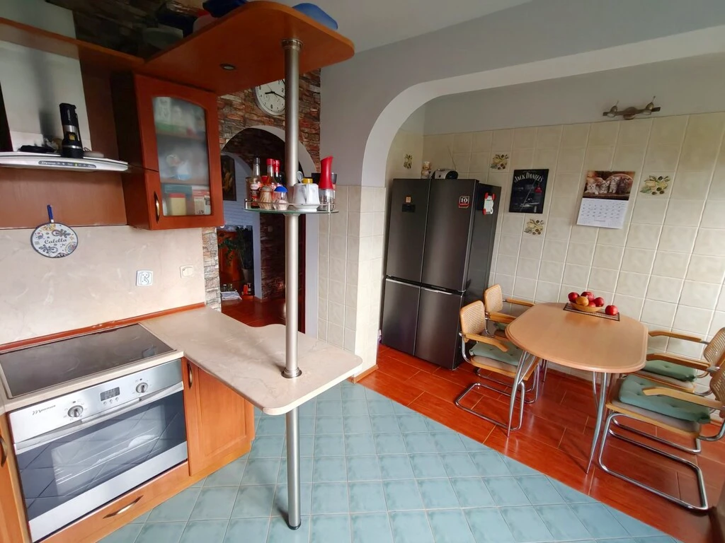 - Moderne Küche mit Essbereich (ca. 16 m²) – komplett ausgestattet mit maßgefertigter Einbauküche und Elektrogeräten. Der Boden ist mit stilvoller spanischer Terrakotta gefliest. Ein direkter Zugang führt auf eine gemütliche Holzterrasse mit Treppe in den Garten.