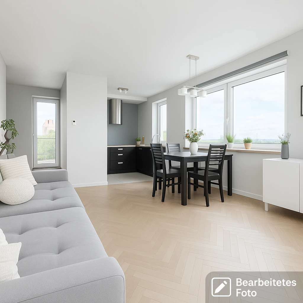 Der großzügige Bereich lädt zum Wohnen, Kochen und Verweilen ein – die zahlreichen Fenster durchfluten den Raum mit Licht.