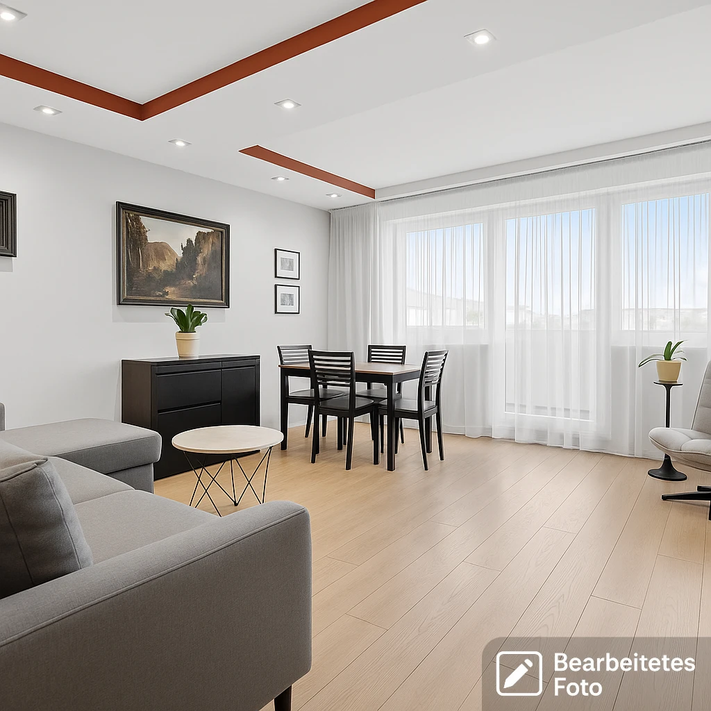 - Das erste Foto in unserer Galerie wurde leicht bearbeitet, um zu veranschaulichen, wie die Wohnung aussehen könnte – beispielsweise durch eine geänderte Wandfarbe. Die nachfolgenden Bilder zeigen den tatsächlichen Zustand der Immobilie.