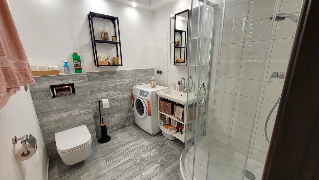 - Badezimmerausstattung: Waschmaschine, Dusche, WC