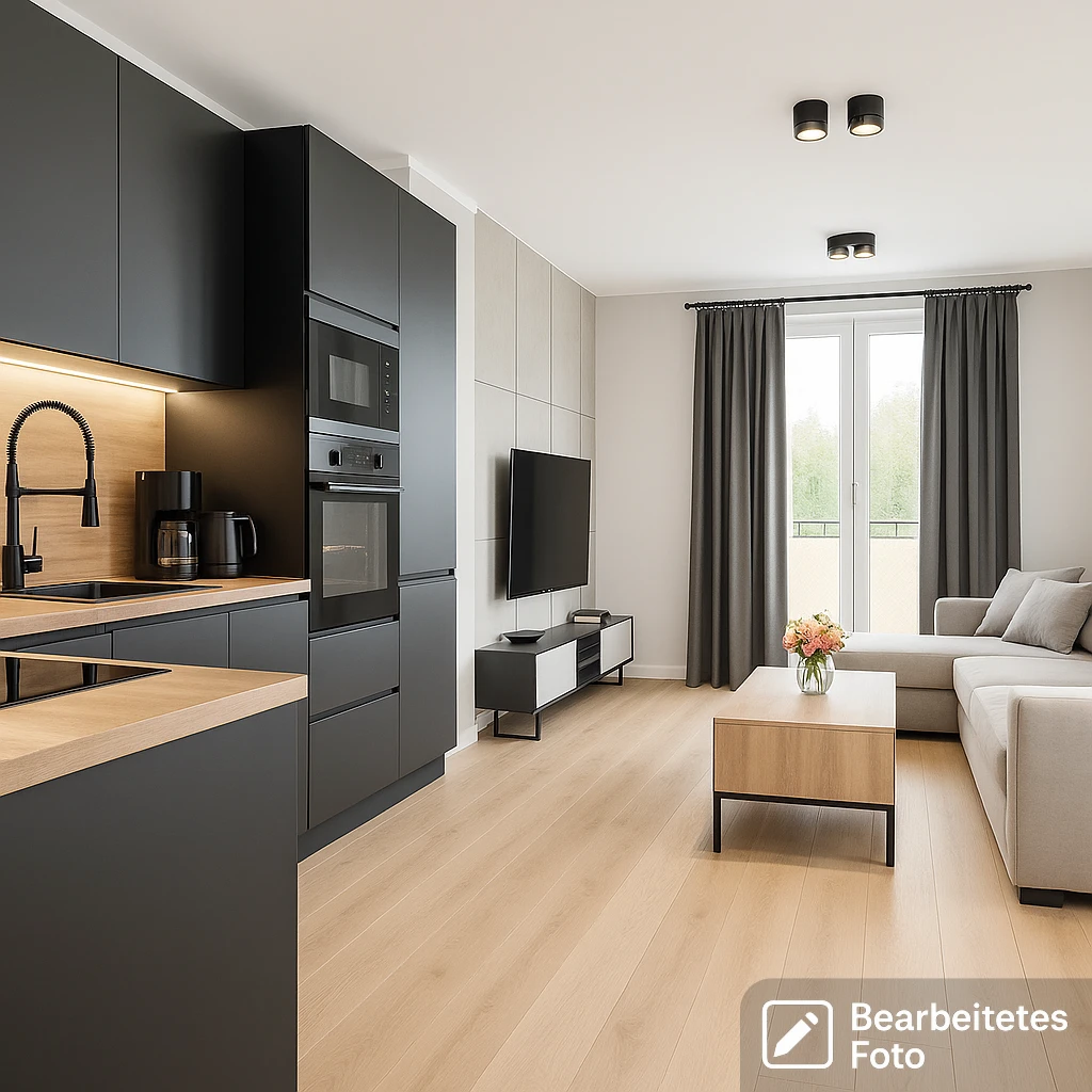 - Großzügiger Wohnbereich (ca. 22 m²) mit offenem Küchenkonzept und direktem Zugang zum Balkon – perfekt für gemütliche Abende oder sonnige Frühstücke