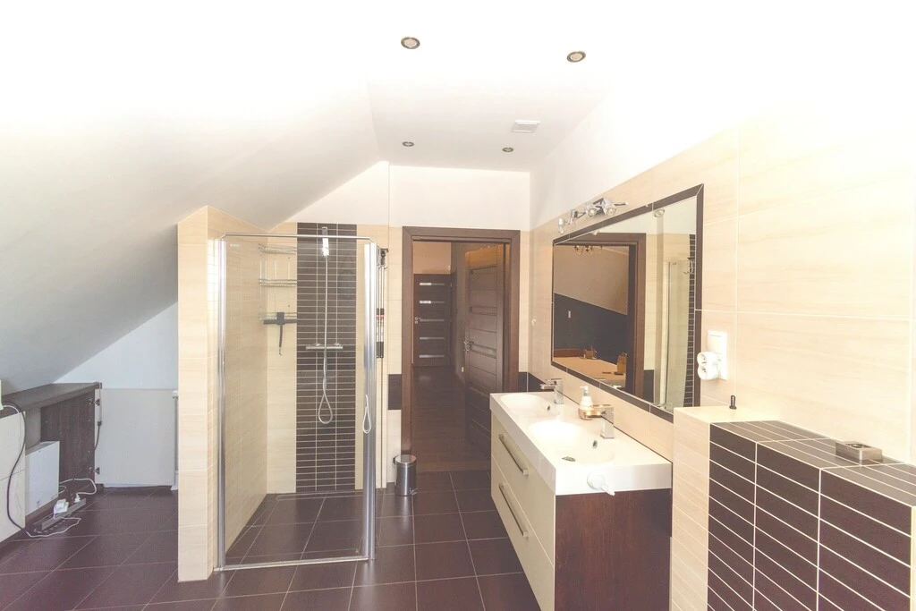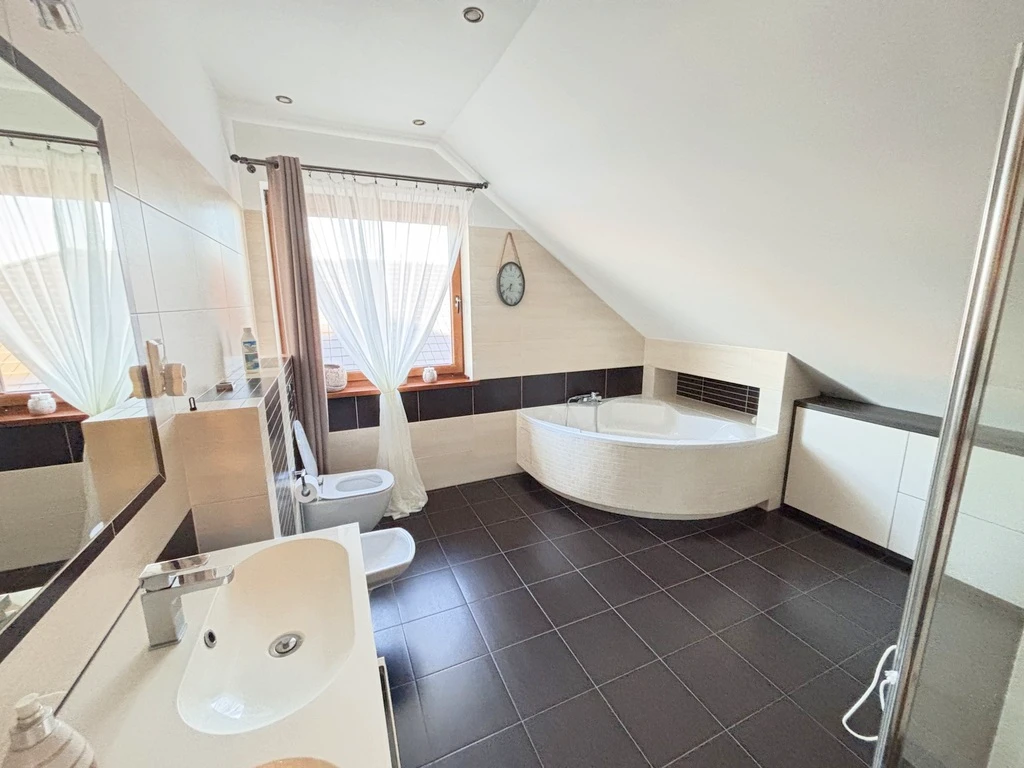 - Großes Familienbad mit Badewanne, Dusche sowie Platz für Waschmaschine und Trockner